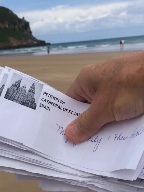 When I walked across Spain in June I was carrying over 150 slips of paper with individual prayers written on them by my friends and parishioners. On the long walks each day I’d take them out of my pocket and read them individually. Most times I had no idea who had written them, nor did I usually know the people who were mentioned on them. Some were asking for a family to be reunited. Others were asking for someone to recover from cancer, or a heart condition, or a terrible loss or death in the family. One was asking that her son get a job, another that his wife would be able to have a baby. Someone wanted God to help her believe that she was a worthwhile human being. Another prayed that he wouldn’t lose his house. A few asked for genuine peace in the world, or for justice for poor people. As I read them each day, I tried being with the people who were the objects of the prayers, and also with the people who wrote them. I looked at the handwriting, sometimes very scribbled, sometimes very neat and clear. More than a few times I traced their pen strokes with my finger as I tried to be with the writer. The petitions became a very important part of my day and my walk, and I intended to bring them to my destination point in the city of Santiago, to lay them at the tomb of St James, whose feast day we actually celebrate tomorrow.